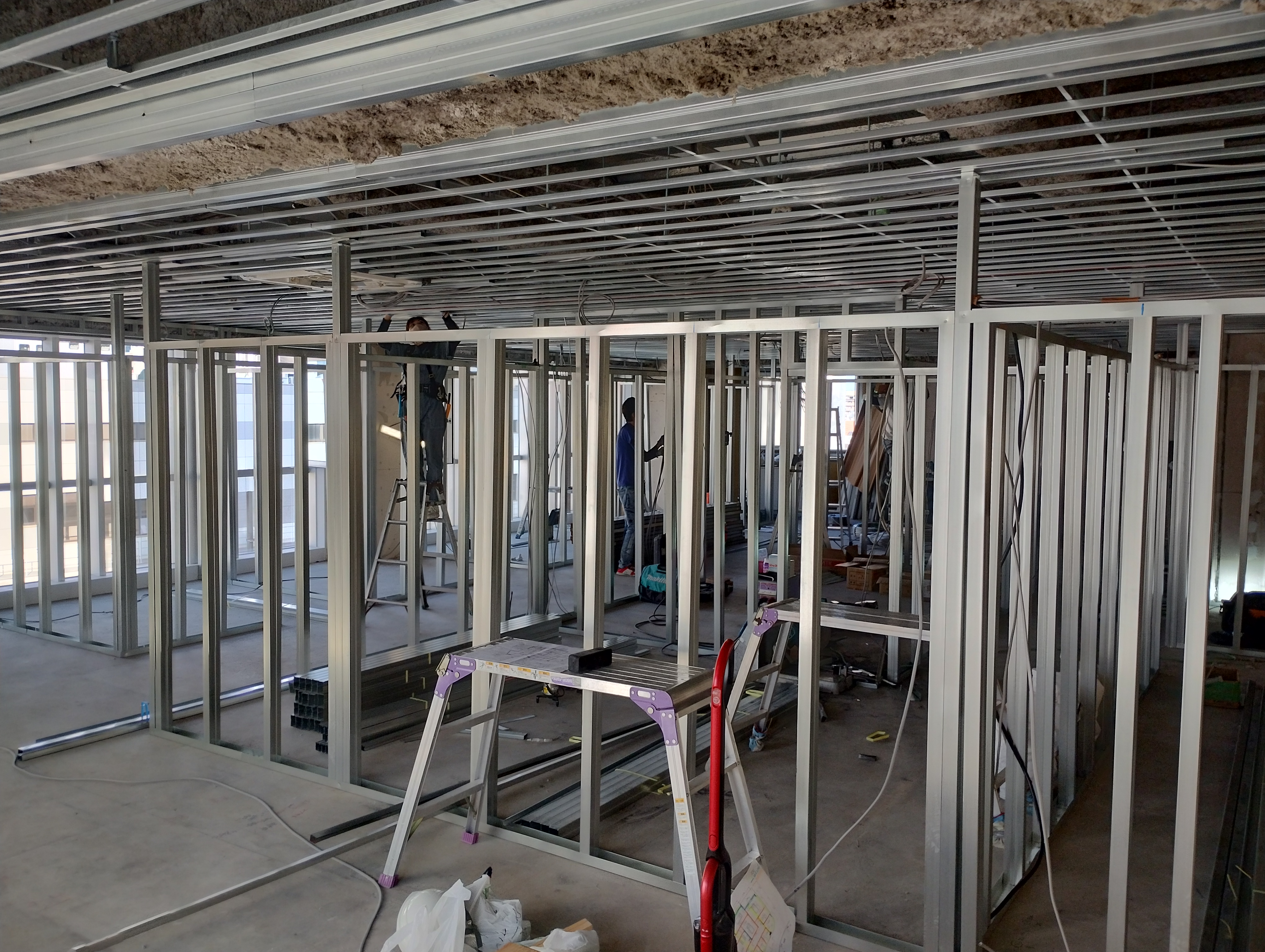 軽鉄材や軽天材とも呼ばれております。 LGS工事とは、建物の躯体の何もない区間に壁間仕切りや天井の骨組を作る工事です。